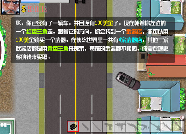有足够的钱可以到武器店买武器,游戏里一共设有5个武器店,每个武器店的武器都不一样,武器店在游戏中是用黄色的三角来显示,跟着黄色三角走就可以找到武器店。