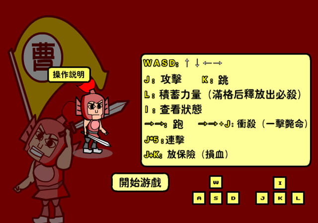 操作方法:单击蓝色关卡进入游戏,WSAD移动,J键攻击,K键跳跃,L积蓄力量(满格后释放必杀),I查看状态。