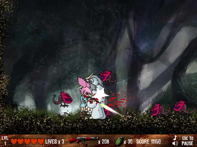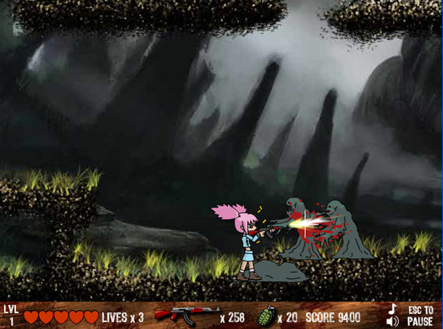这是一款横版射击类游戏,主角是一个暴力小萝莉。游戏里有很多武器可以捡到或者消灭敌人得到。用鼠标滚轮可以切换武器,Q E键也可以切换,WSAD为人物操作,空格也可以跳跃,鼠标控制武器准心,左键开火。是一个很简单的游戏,更何况是无敌版呢。大家可以去看看小萝莉大战触手系生物吧。