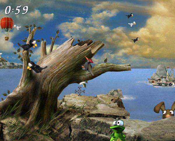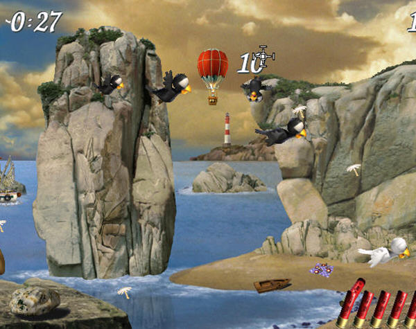 游戏画面采用怪鸡系列传统风格,背景设定在海岸边,各种有趣的动物刻画的惟妙惟肖,画风十分细腻。游戏的音乐充实,射击效果好,上手及其简单,用鼠标右键上好子弹,移动鼠标瞄准,按下鼠标左键进行射击。
