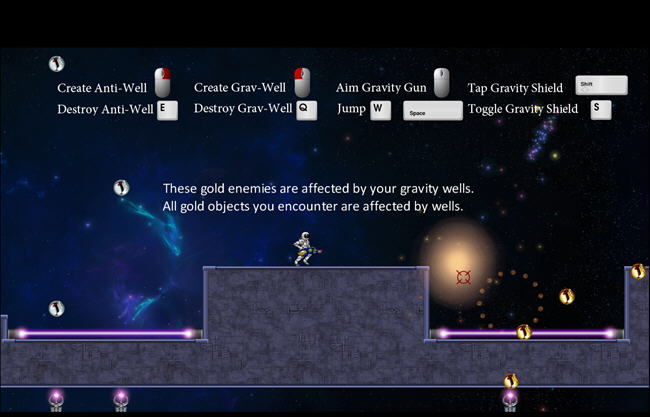 这是一款横版射击过关游戏,你要用特殊的子弹来制造空间旋窝是自己被旋窝吸附或者是弹射。
