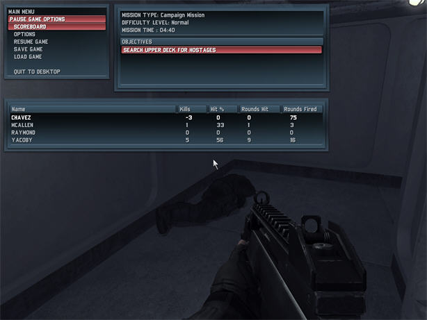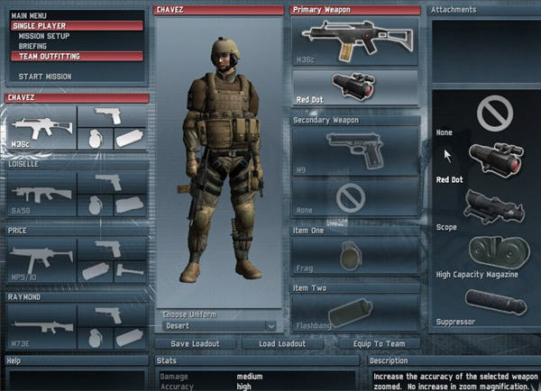 作战中,玩家将会预先观赏到每个任务中提供的精彩录像简报,广阔的地图展示和强大的团队阵容。和前作相比,交互性更强。每一个团队成员都具有同样的熟练技巧,都可以在兵工厂中选择最好的武器。比如说MP5冲锋枪,格斗散弹猎枪,或者Armalite等精良武器。实际上,游戏中的武器类型有很多种,每一种武器等级不同伤害力也不一样。根据杀伤威力不同,军火弹药花费的价格也不一等。