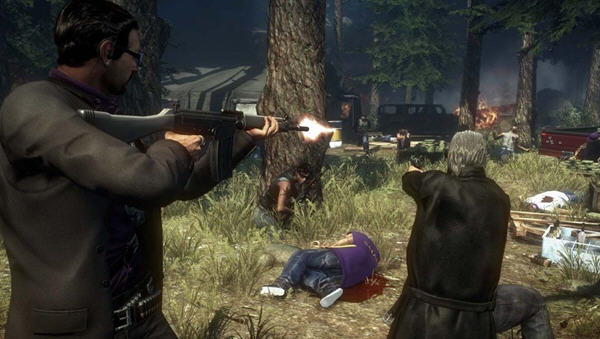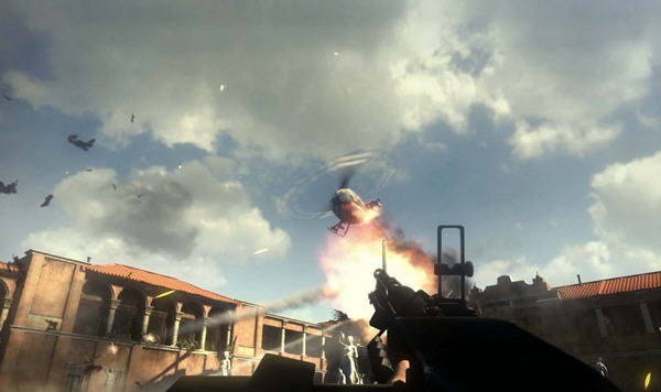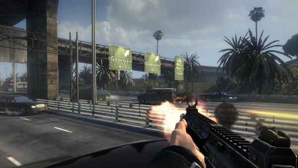游戏一开始是在一条公路上,在晃动中爬出车天窗,瞄准我方车辆右侧的越野车射击,和普通的FPS操作一样,左键开枪右键瞄准,干掉后面追上来的敌人的汽车。。。