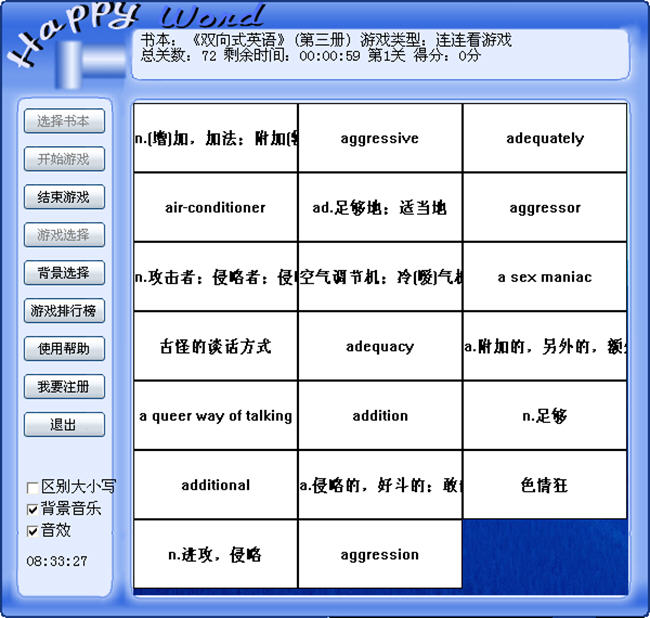 本软件提供了6个精彩英语小游戏,游戏得分可上网排行。可帮助您边学边玩,在不知不觉中记住了许多单词。这些游戏包括了连连看游戏,打字游戏,单词选择游戏,词义选择游戏,由单词选择音标,由音标选择词义。另外提供了丰富的词库,包括幼儿,小学,中学,高中,大学,研究生,托福等各级别的200多个常用词库。