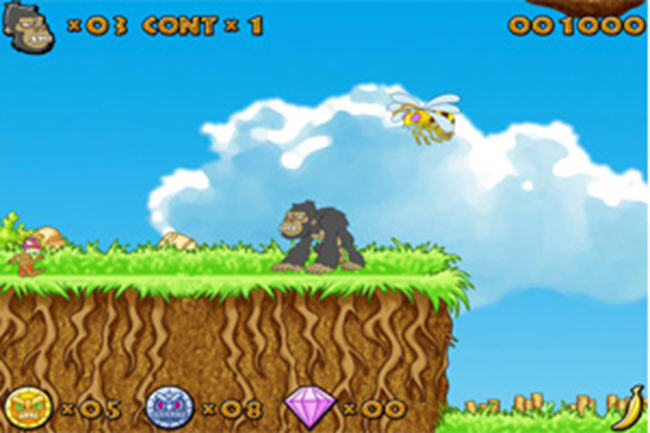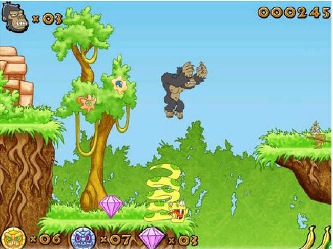 帮助它穿越各式各样的危险,火山和陷阱,用拳头和吼叫击败原始人、吃人的植物、比拉鱼、以及战士军队等敌人,通过漫长的冒险前往都市