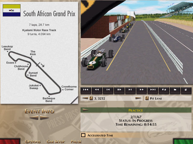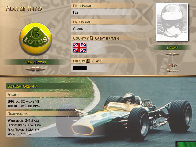 一个模拟1967年F1赛季的赛车游戏怎么会有趣呢?会有趣,因为它反映了那个时代赛车界倍加残酷的现实。在赛车几乎没有安全设施和引擎限制要求的情况下,1967年F1 赛季是赛车运动史上最危险的赛事之一。加大的马力,没有下压力,硬如磐石的斜交轮胎,油箱不被放置在驾驶舱里而且特意设计得塑造成包裹着车手的布局,至于安全带……那又是什么呢?事实上,那时候人们普遍认同的看法是发生事故时,与其被系在车子上,还不如早点儿被甩出来的好。想想车手们竟然坐在装满特殊配制、高挥发性的40多加仑燃料的薄铝箱中间,谁还会说些什么呢?幸运的是,我们不必担心安全带问题,还可以为不会受到一个小小的擦伤而得意。伴随着作为一名赛车运动史上经典时期F1车手的真实感,Grand Prix Legends(GPL)带你来到另一个赛车时代,那个个人驾驶技术远比机器重要的时代。像Brabham, Clark, Gurney, Hill, Hulme, McLaren, Surtees等等车手会列入你的挑战者名单,与你在一些历史上最著名和富有挑战性的赛道上较量。那是在1967年。Jack Brabham是一级方程式赛车世界冠军,在他自己的车队里与Denny Hulme是搭档;而在Lotus车队,前任世界冠军Graham Hill的队友Jim Clark正处于赛车生涯的巅峰;未来三届世界冠军Jackie Stewart正在为BRM车队比赛;另一个前任冠军,John Surtees则在为Honda车队效力;Bruce McLaren在他的All-American Racing Eagle队和Dan Gurney一样,用自己的赛车参赛;Ferrari方面,Mke Parkes、Chris Amon和Lorenzo Bandini 形成了另一支强有力的队伍;Joachim Rindt、Jo Bonnier和Pedro Rodrigues在Cooper车队并肩作战。伴随着作为一个真实赛车手的感受,Grand Prix Legends带你来到另一个赛车时代,那个个人的驾驶技术远比机器重要,只有靠用木牌来向车手报告即时赛况的时代。车子靠够胆量的车手用右脚保持着微妙的平衡,驾驶在蜿蜒地穿过战后初期欧洲森林、郊外和乡村的赛道上。时速超过185英里,坐在脆弱的镁制车架中间、被装着40加仑高挥发性特制燃料的铝制油箱包围着……没有安全带。那是一个赛车运动被设计成用来测试人的极限,而不是安全的时代。一个车手的能力远远重于他手中的机器的时代。作为迄今为止最准确无误和引人入胜的赛车模拟游戏之一,Grand Prix Legends捕捉了这一体验。游戏建立在高级的3-D模型引擎上,创造出真实的驾驶感。汽车的滑行、漂移、颠簸、打滑都惊人的真实。随着驾驶技术的提高,你就可以开始在那个时代的重大竞赛中谱写传奇:与Jack Brabham,Jim Clark 和 Graham Hill这样的车手较量。你和历史上那些了不起的F1车手比试车技的机会来了。"拟真" 一直是许多赛车游戏所标榜的特色, 但试问有多少赛车游戏是真正拟真? 而 Grand Prix Legend (以列简称 GPL) 是否又是一个 "有名无实" 的赛车游戏? 难道真的有让人头皮发麻, 血脉沸腾的 "超拟真" 赛车游戏?GPL 是由 Papyrus Racing 开发, 1998 年 10 月发行的赛车游戏. 当时 Papyrus Racing 已是赫赫有名的赛车游戏开发公司. 拥有全新 3D 引擎(Papyrus 第一个有 3D 加速的游戏), 精细物理性引擎的 GPL 正是让 Papyrus 迈向更高峰的游戏. 不仅如此, 一直到今日, GPL 仍是死忠派 (Hardcore) 赛车玩家公认 "最拟真" 之一的赛车游戏 .Grand Prix Legend 顾名思义, 就是模拟旧代 Grand Prix, 也就是现在大家所熟悉的 Formula One (F1) 赛车的前身; 而且模拟的是 F1 赛车史上的一个具有历史性的年份......1967 年. 为什么是 1967? 因为当时的 GP 赛车不仅车辆轻, 马力大, 更重要的是, 1967 是最后一年 GP 赛车以完全无"下压力辅助"(扰流版之类)参赛. 再几乎无马力限制下, 当年 GP 赛车的危险性和挑战性是出奇的高.GPL(原版)里总共收录了 7 台赛车, 五台是历史上赫赫有名的 Lotus-Ford 49, Repco-Brabham BT24, Eagle-Weslake T1G, Ferrari 312, 和 BRM H-16. 另外两台则是 "虚拟的"(Fantasy) Murasama 和 Coventry (因版权问题, 代替了Honda 和 Cooper). 每辆赛车不仅都有自己的内装, 性能和正确的图装, 引擎浪声和操控也真实的模拟了; 车辆物理性运用了 "四点式物理性"(4-Point Physics, 也就是类似 NFS5, F1 Challenge '99-'02 所用的物理性计算类型), 加上精心计算的 "空阻运算" (Aerodynamic) 和 轮胎抓地力/磨擦力 (Tire Grip/Friction... 4 个轮胎是分开各自计算). 除了感觉不到震动, G-直, 闻不到废气味, 车子的反应有如开真车一样可以靠车重的前拋后移做出 转向过度 (Oversteer), 转向不足 (Understeer), 甚至是四轮侧滑 (4-Wheel Drift)!有了具有 "超拟真" 物理性的车, 当然少不了好的跑道啦! GPL 共收录了 Monaco, Watkins Glen, Zandvoort, Imola 等共 11 条跑道. 每个弯道, 每吋路面都是依照 1967 年的样式完完全全的模拟出来. 有了跑道和车辆, 当然也少不了 AI. AI 车手除了名字依照 1967 年参赛的车手外, 连各车手开车的技巧/特色也都包含在程式记算之内. GPL AI 因此是非常的有挑战性: 卡位, 超车, 跟车样样行. 跟 AI 比赛时实在让玩家很难说服自己是跟 AI 比而不是一个活生生的赛车手!!然而 GPL 拥有这么多其他赛车无可及的特色, 它仍然有不及近期赛车游戏的地方: 画面是 GPL 最大的致命伤! 在没安装官方修正档之前, GPL 只有支援 Rendition 和 3Dfx 两种显示晶片. 即使装了官方的 D3D 修正档, 画面仍不及现代的赛车游戏. 不过这个问题可以透过玩家做的 3D 车体外掛而改善. 2001年升级版做到了.GPL 是 PC 赛车史上的一部经典名作. "超拟真" 的物理性更是无人能敌. 但也因如此, 让很多原本