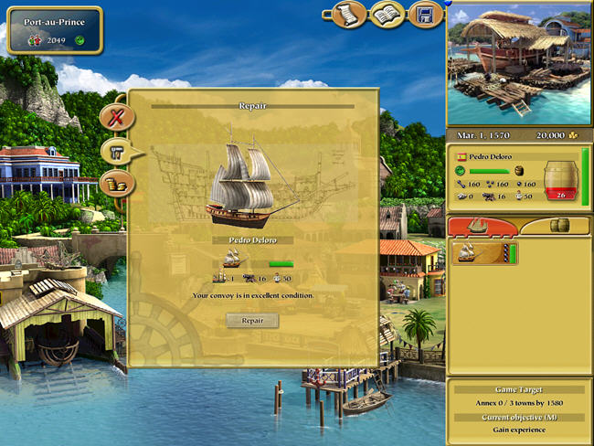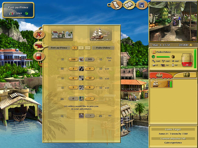 游戏的时间背景的跟大航海时代一样的中世纪,大概跨度是15xx-16xx年。而那时候的航海确实是每个欧洲人的梦。我们的主角开始只有一艘船和很有限的资金。而我们所需要完成的任务就是利用手上有限的船只和资金来努力扩大自己,你可以完成任务,来往城市直接做生意,当然还有当海盗抢劫,从而成为整个海洋的霸主。