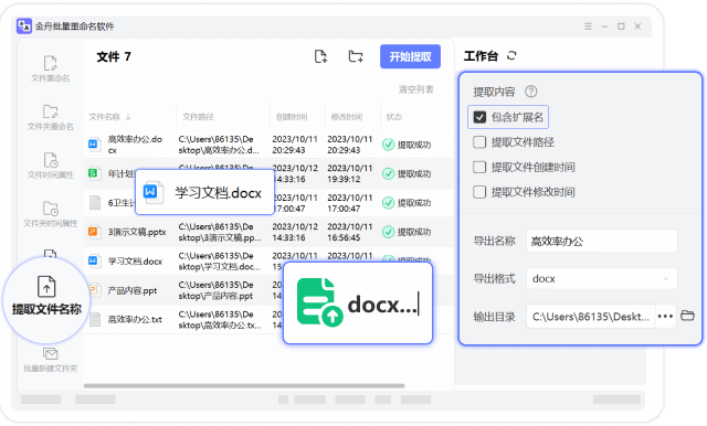 一键批量提取文件或者文件夹名称,支持将文件名导出成 xlsx、docx、TXT 格式,还可以提取拓展名、文件路径、文件创建时间、文件修改时间,大大提升工作效率。