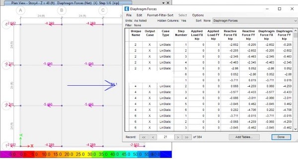 一个新表格显示了作用于选定楼层的柱和墙位置的施加、反作用和净隔膜力。