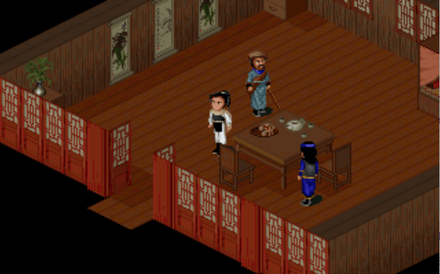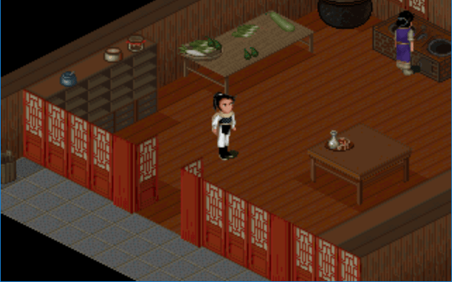 出庙才知天亮了,回到客栈被大骂一顿,并得知房间已租给神秘的苗人;看看苗人搞啥名堂,从柴房(婶婶房旁)的绳子密道到房间,打开麻袋发现是一女孩(灵儿),但也惊动门外的人,两三下就把苗人摆平了;经灵儿相告,得知佬佬有危险;到码头找张四乘船到仙灵岛,但还是来晚一步;佬佬死前将灵儿托李逍遥照顾。