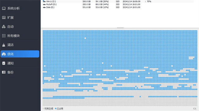 扩展:能够分析 Win 旧版本文件、预取文件、文件使用情况等。分析结果可以一键优化,使系统更加干净简洁。