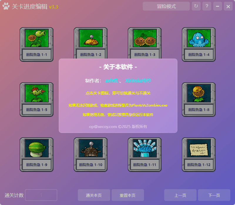 注意,需要同时运行植物大战僵尸杂交版游戏和关卡进度编辑器;