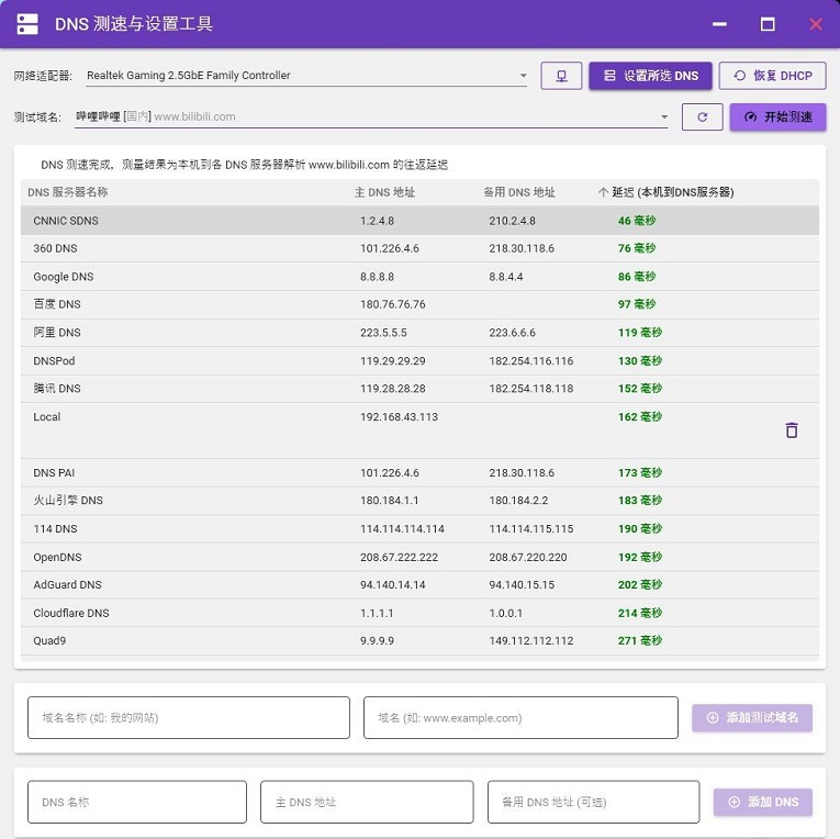 多DNS服务器测速:内置多个国内外公共DNS服务器,可一键测试延迟