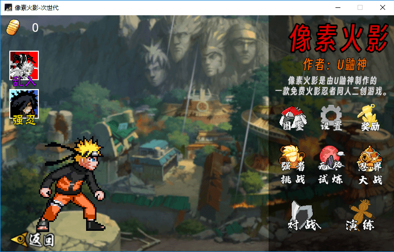 像素火影次世代pc版由up主U鼬神根据火影忍者动漫所改编的横版格斗类游戏,支持多人联机体验,目前推出1v1和3v3,仅限于双方操控玩家使用同一台电脑进行对战,还是有一点的局限性,但是和朋友一起玩还是非常不错玩家们在游戏可以见到许多动漫当中的角色,比如漩涡鸣人、宇智波佐助、小樱等,虽然说人物形象采用了像素风格打造,但是人物的特色都完美还原,并且拥有多个不同的形态,比如三代火影解斑、四尾鸣人、须佐止水、面麻等,给玩家提供原汁原味的火影体验。此外,像素火影次世代在技能特效上做的非常亮眼,各种炫酷的技能必杀技绝对可以让玩家玩的尽兴。在玩法模式也是考虑不同操作水平的玩家,有着难易不等的模式,玩家可以根据自己的实力来挑选合适的模式进行体验。