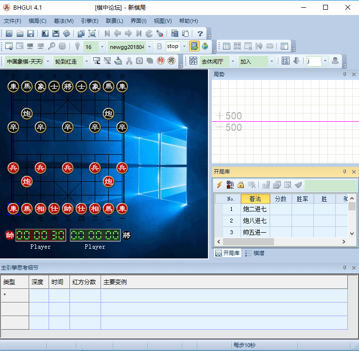 棋盘窗口为主窗口,显示棋盘和红黑双方的时钟。计时是自动进行的,智能化设计,省去用户的麻烦。用户一旦下达引擎执黑或者引擎执红命令,或者用鼠标触动棋子,计时器便开始工作。结束引擎执黑或引擎执红时,计时器暂停,喝杯茶后仍可继续下棋。