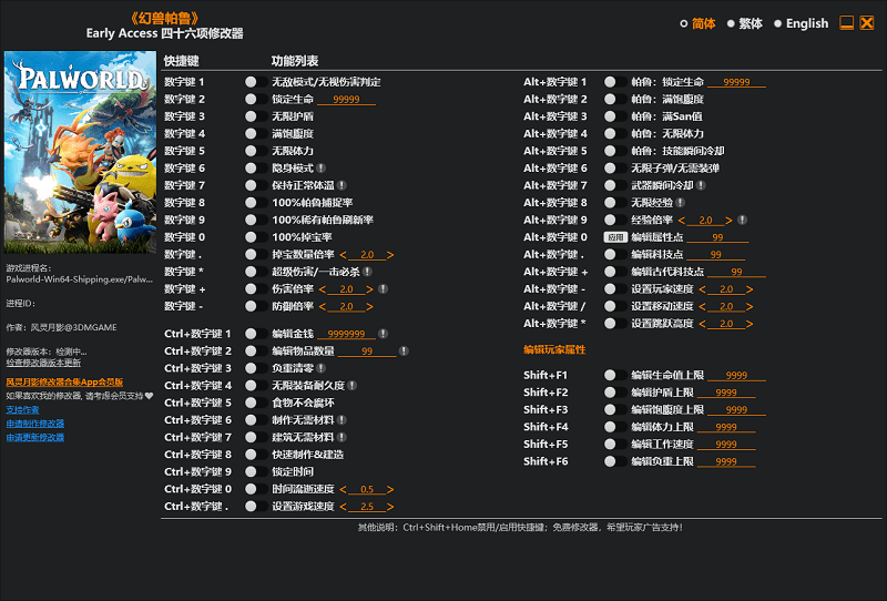 幻兽帕鲁修改器按键说明