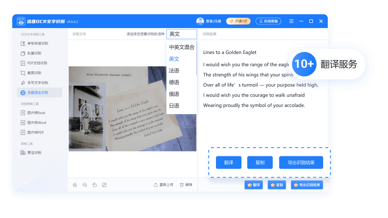 提供十几种语言的翻译服务,对图片中的文字进行OCR识别后,可以选择想要识别的语种进行翻译,再复制文本。