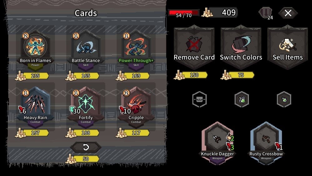武器可以双手握持,玩家可以手持双匕首实现最大伤害,也可以一手持剑一手持盾稳扎稳打,甚致使用双手巨剑大杀四方,配合牌组找出每次战斗的最佳组合。