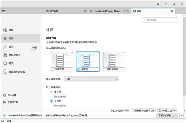 雷鸟邮件客户端thunderbird官方中文版能够便捷的管理邮件,支持在这里写邮件和接收邮件,支持将邮件的数据导出到移动设备上,还能切换主题和设置外观,支持按照关键字来搜索邮件,可以同时打开多封邮件。