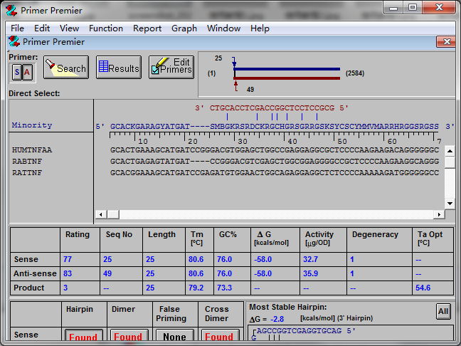 4、总之,“Premier”有优秀的引物自动搜索功能,同时可进行部分指标的分析,而且容易使用,是一个相当不错的软件
