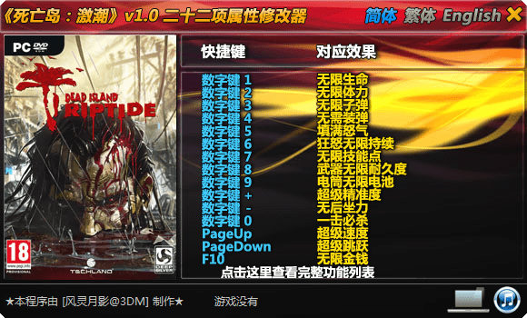 死亡岛激流修改器是风灵月影打造的全版本通用版本,死亡岛激流又称为死亡岛浪潮,在steam上面叫做Dead Island Riptide Definitive Edition,此版本修改器支持修改终极版,内置22项功能,包括无限生命、子弹、体力等,注意先开始游戏,再开启修改器。