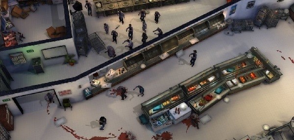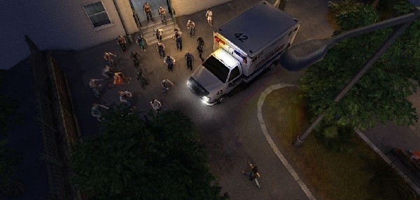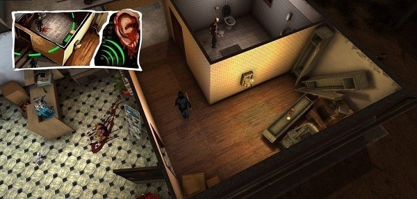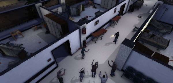 我们从加油站的正门(左边的门是锁着的)进入小屋,接着看见有一个僵尸正在趴着美美的吃肉(貌似是在吃肉),不过室内还是比较亮堂的,加上是俯视第三人称,恐怖感并没有多强悍。