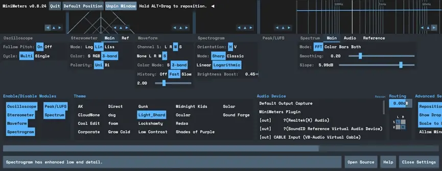 minimeters下载安装包作为音频可视化软件,可以捕捉电脑上所有音频输入和音频输出的声音,还可以通过搭配其他组件,来捕捉宿主的声音;它最大的优势在于,不仅仅可以随意移动可视化模块,还可以自定义外观和主题,实时监听所有audio通道。