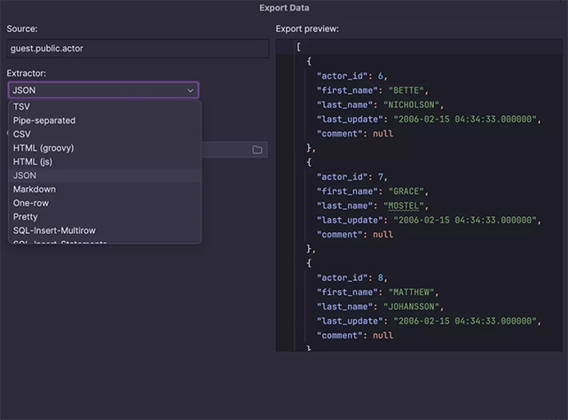 除了从脚本文件、CSV、TSV 或具有分隔符分隔值的文本文件导入之外,您还可以使用您喜欢的格式导出数据,包括 CSV、JSON、HTML、Markdown、Excel 等 – 您甚至可以自行创建格式!