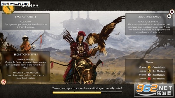 不对称:每名玩家在开局时都拥有不同的资源和资产(能量、金币、敏锐的战斗意识、声望值等)、起始位置和秘密目标。每个势力的起始位置都是专门为增加势力独特性和游戏总体的不对称性所设计的。
