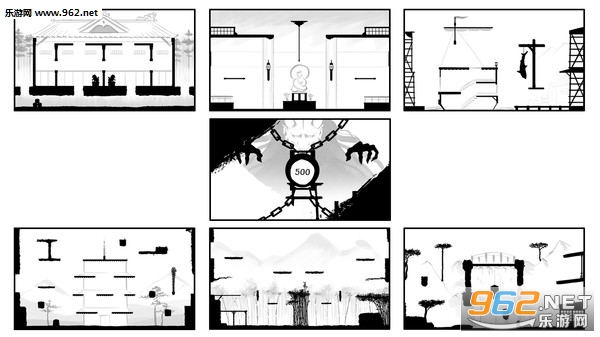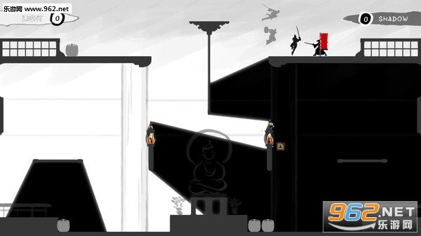 分两个队伍-黑与白,黑队的黑色人物可以隐藏在黑色场景中(仅限站着不动时),但这白色场景中特别明显;白队的反之。主要操作就是攻击和跳跃,攻击分为原地攻击和方向键+攻击,一般杀人都是方向键+攻击即冲刺斩。跳跃最多支持二段跳,一段跳跃后可接冲刺斩秀操作。再就是有一个道具键,可以使用捡到的道具(手里剑,铁蒺藜,烟雾弹)。还有一个可能用到的就是静步键,静步之后在相同颜色中行走不会被发现(跑不行),暗杀用(然而大部分时间都在冲刺斩,暗杀个毛)。