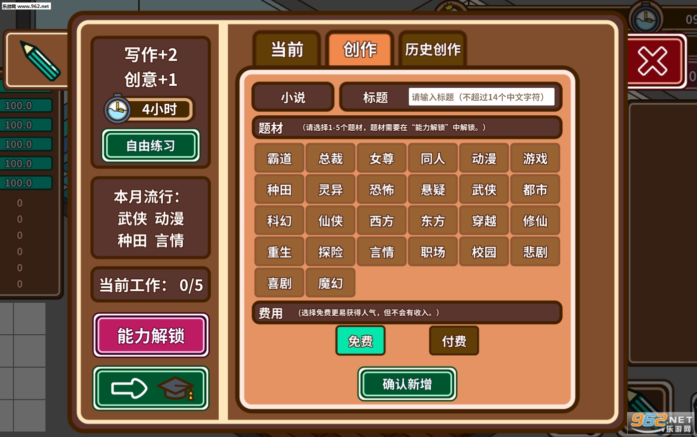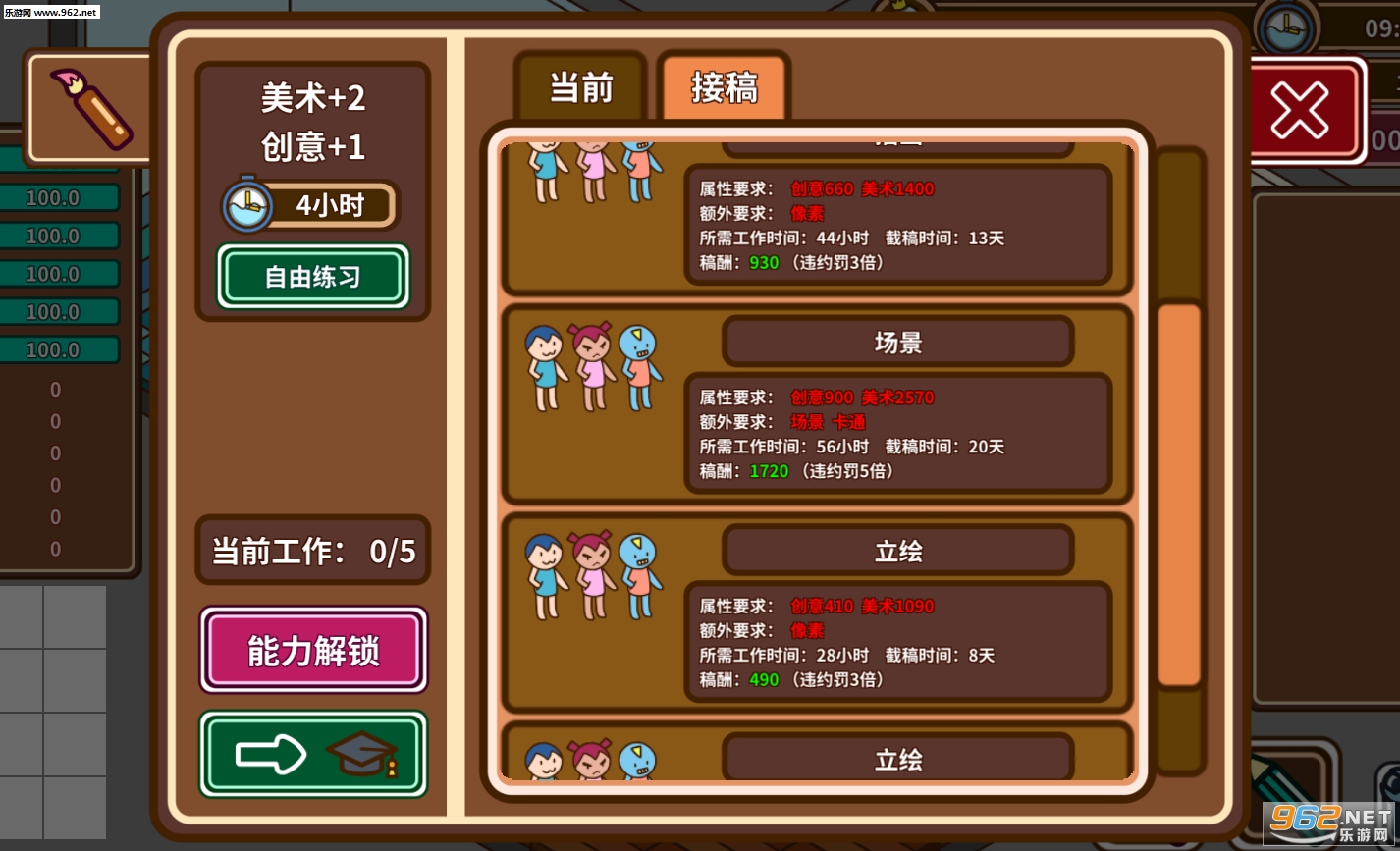游戏中玩家可以变身成为一名拥有超强写作能力和作画能力但是从来不喜欢出门的角色,玩家只能通过接受各种委托来进行创作,根据不同的组合来创作出满意的作品!