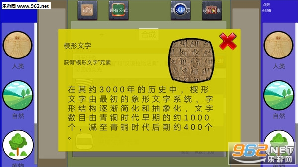 《创史者Hist Maker》从功能上讲,是一款历史教育类游戏;从玩法内容上讲,是一款元素合成类解谜闯关游戏。核心玩法流程就是通过尝试组合游戏中现有的元素,得到越来越多的各种元素,最终达成通关目标。所谓“元素合成”则类似“人”和“石头”元素组合可以合成“石器”,而“石器”又可能可以和其他元素合成新的元素,等等。要通关的话也需要玩家自己去开发脑洞、探索,同时思考、解谜。