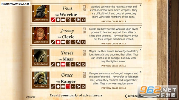 ·7个英雄可选择:战士、法师、牧师、游侠、盗贼、魔法师和野蛮人。
