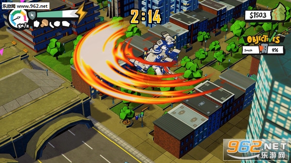 为了送披萨而不惜毁掉城市..请问这样的披萨多少钱一份?给我整一个好了。游戏中玩家可以选择4名人物,驾驶各有特色的机甲在城市中送Pizza,另外还有些额外任务可供选择。