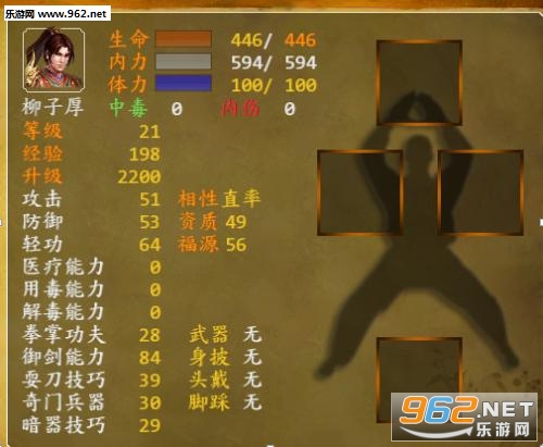 基本属性不用多说,主要通过人物升级和修习武功获得。属性越高能力越强。其中比较特殊的两个属性是资质和福源。我们经常听见“天才薄命”和“傻人傻福”这样的话,这提现在游戏中就是通常资质高的人福源就较低。