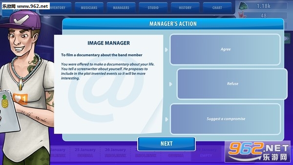 《乐队经理(Music Band Manager)》是Hamsters Gaming制作发行的一款模拟经营游戏。一直想望创建自己的音乐团队及走向星星吗?目前您的梦想可以实现!欢迎进入我们游戏,您可以在车库开始排练,并发展到世界著名舞台上表演的乐队。您可以录制不同的歌曲,给出歌曲名字,发行专辑。也可以管理每个音乐家的所有活动!