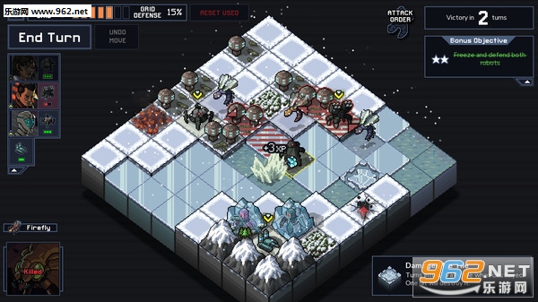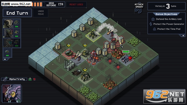 游戏本质上是个回合制游戏,每个小关的主要目标是保卫建筑物不被攻击,并坚持一定回合。如果建筑物被攻击就会损失能量。能量降低到0则游戏结束。敌人在他们的回合会进行移动或者使用干扰的技能,不过敌人的攻击会在你的回合结束之后才进行,而你可以看到敌人攻击的提示。在自己的回合你可以通过击杀敌人,推走敌人等方式来阻止敌人攻击建筑物,甚至可以让敌人相互攻击 把敌人推到特殊地形秒杀。