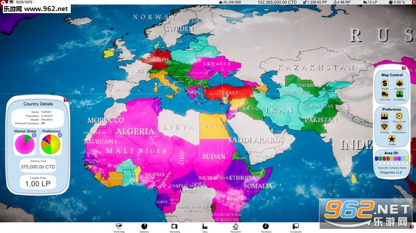 将您的公司以巧妙的方式扩展到多个国家, 建立更多的办公室、工厂、实验室和其他所需的设施。穷国的工作力比较便宜, 但富裕国家会给你更多受过教育的工程师。