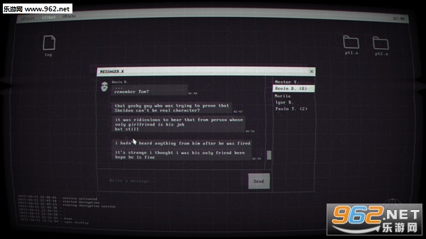 先说说Demo,在Demo里面玩家扮演的是Tom,也就是本体里James破译的文本主角之一。Kevin受Tom的胁迫(不一定是胁迫,反正是欠Tom一个人情)发送了一份有关Mariia的秘密文件给Tom破译,破译完后玩家可以对Mariia的性格有一个大概了解,然后Demo以Eliza的聊天邀请结束。(其中有全成就的重要线索——另一个账号的密码)