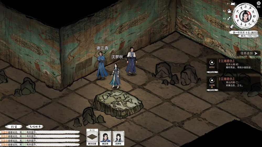 这一切的互动可以归纳到一个好感度体系里面,之后可以和他&她成为莫逆之交、义结金兰&举案齐眉等等,除此外,游戏里还做了一个精力系统来对应这个人际玩法——人际交互消耗精力,吃饭打坐回复精力,不过数值可能还需要再打磨。