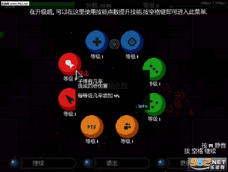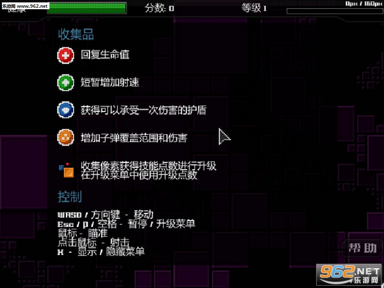 《像素净化》是一款第三人称上帝视角的射击游戏。游戏的机制很简单并且没有太多的装饰,控制一个人物对周围涌出的幽灵点点点来干掉它们,并且在消灭掉敌方单位之后可以获得一定的经验值,升级后强化自身的属性~慢慢的RPG元素。