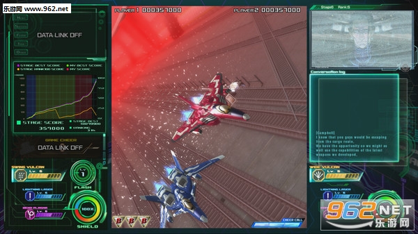 论技术实力,MOSS这种小日厂那必然是不怎样,所以《雷电5》的画面算不上多好,但是画面相对《雷电4》进化是蛮大的。STG游戏因为是竖版,所有两边都有大块的空缺,一般只是展示火力、残机、BOMB和分数。而《雷电5》充分利用了这两块,把剧情对话与人物立绘放在右边,火力阶段、分数、cheer数等放在左边。使得游戏界面显示内容更加饱满详尽,玩家可以清楚地看到三种火力的等级与分数的分析图,比之前《雷电4》单纯的背景图好了不知多少。