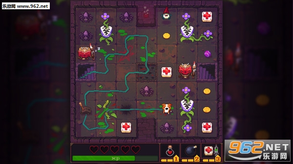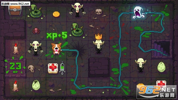 然而这游戏最大的难点就在于表面上是地牢roguelike策略游戏,其实是一个一笔画游戏。你走路选择错误你就要错过这儿的血包那儿的宝箱,不能走回头路,甚至不能走被自己路线挡住的路。