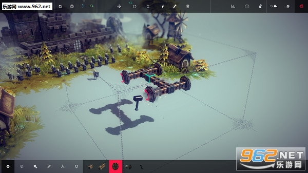 《Besiege》采用了非常棒的物理引擎,虽然目前游戏还只是测试阶段,模式比较单调,超高的自由度依旧可以让玩家玩的不亦乐乎。玩家在游戏中任意建造一个攻城机器,摧毁系统给出的目标即可。组建攻城机器的零部件在左下方显示,玩家可以发挥自己的想象随意建造。建造完毕后点击左上角的三角按钮,我们就可以观赏机器摧毁房屋的宏伟场景了。