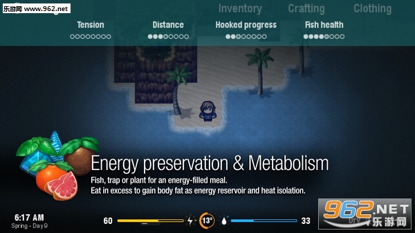 你采取的每一步行动和每一步行动都消耗能量,你只能通过摄入食物来补充能量。如果你用光了精力,你就会失去运气。设置陷阱捕捉野生动物,鱼新鲜的鱼,或收获和重新种植植物。