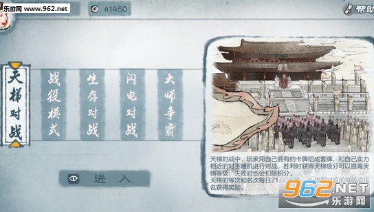 天梯对战:传统的排名战,玩家使用自己构筑的套牌出战,胜利者获得积分和少量奖励,失败者减少积分,天梯根据积分进行排名,每日根据排名发放一次奖励,排名越高,奖励越多。