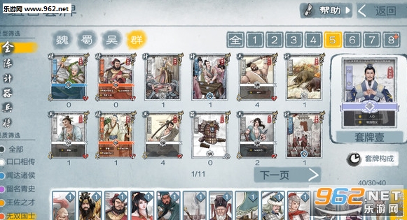 2.用你的卡库中已有的属于这个君主的兵(士兵)、将(将领)、计(兵法)、阵(阵法)、器(装备)五种卡牌构筑一套战斗用的套牌, 套牌总卡牌的总上限数不固定,玩家可以根据需要在30-40张之间浮动。
