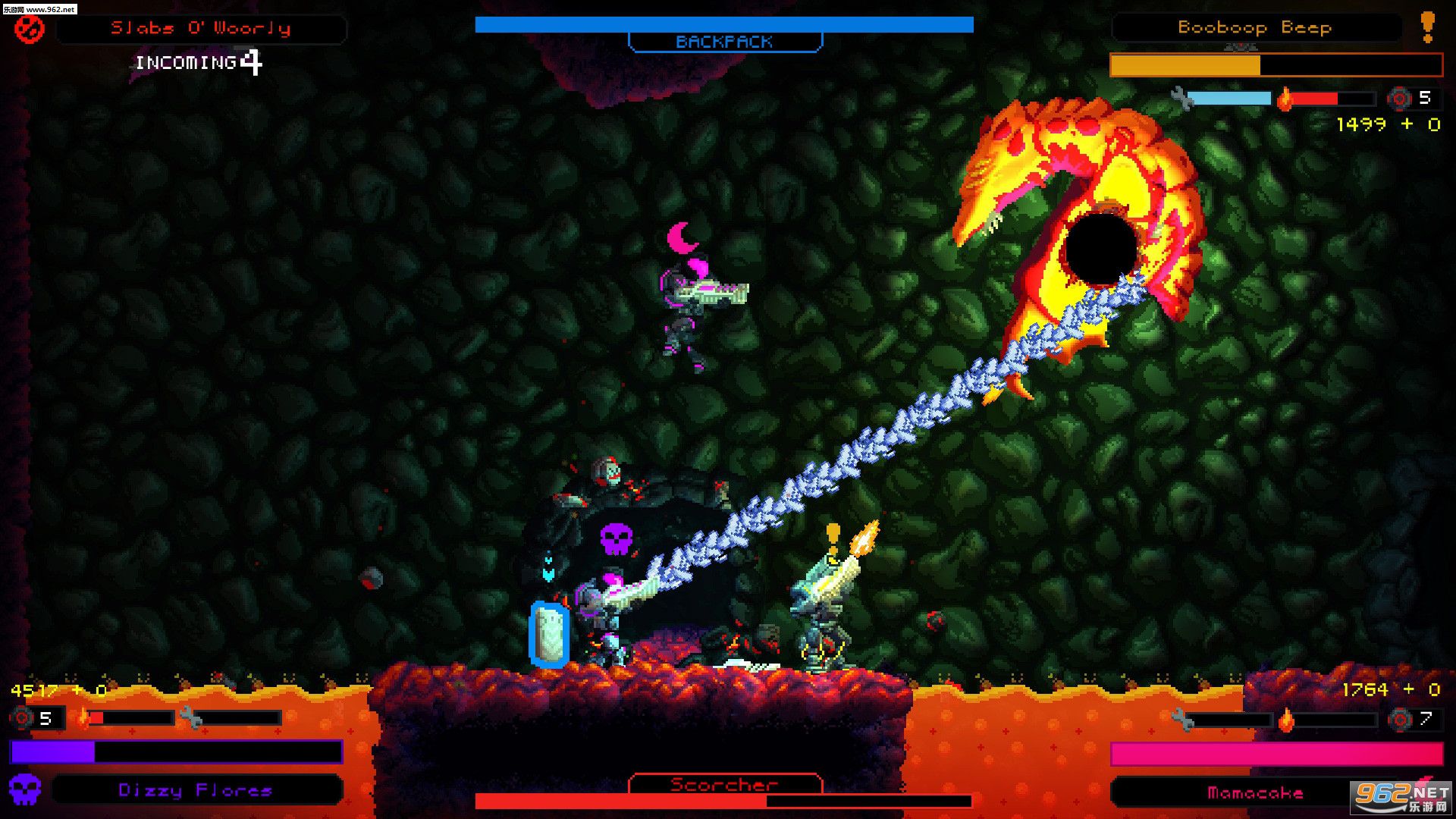 游戏内容的话是有一个背包,能不断的喷气进行飞行,而且死了能通过背包来复活,无限的。不过背包有HP,所以需要小心保护背包(需要注意的是只有你死了背包才会被打倒)