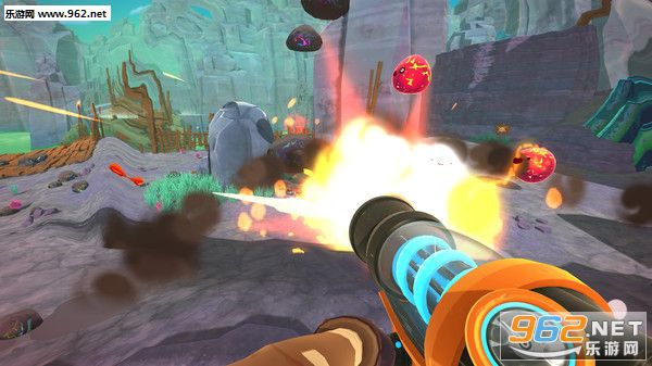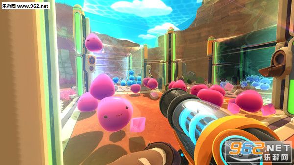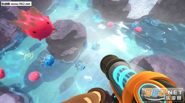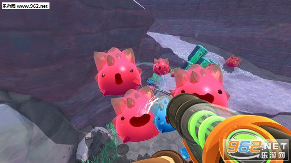 进入游戏后,可以看见玩家扮演的主角手上拿的这把枪就是我们的武器啦~这把枪主要的作用是可以将史莱姆、植物和家禽等等吸收进来,存到自己小背包中,开始时我们的小背包有四个格子,可以放四种不同种类的东西,每种种类的上限是20个,在游戏后期玩家可以升级自己的装备,比如可以扩展自己的背包等等。