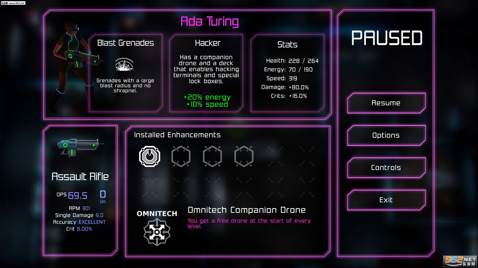 游戏整体进程是分为六章,每章分若干小关,每次重开的时候你可以从到达过章节中选择开始位置。主角是个精英黑客,她可以通过神经连接控制asset(人形躯壳?克隆人?反正这类东西吧)进行行动,每次开始会有3个的asset供你选择,它们有随机生成职业特性与武器技能,关卡过程中可以获得钱、武器、技能与perk,钱可以在你死回家后升级人物的基本属性,这些属性是永久性的,所以可以看得出来游戏是通过属性来限制游戏进程推进速度的,你不花些时间刷点属性是不太可能打到后面的。游戏的操作比较简单,射击、上弹(子弹无限)、近身攻击和使用技能(只能带一种),没有闪避,所以玩起来掩体是比较重要的。游戏里敌人种类不少,boss设计的也有点意思。